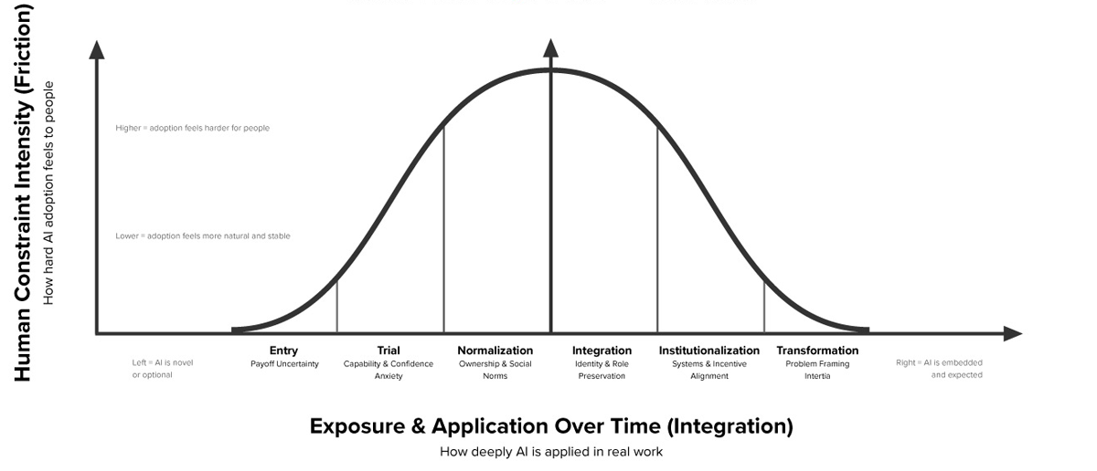 The AI Adoption Arc diagnoses where AI adoption becomes hardest for people as it moves into real work. It focuses on human constraint, not maturity, usage volume, or technical readiness.