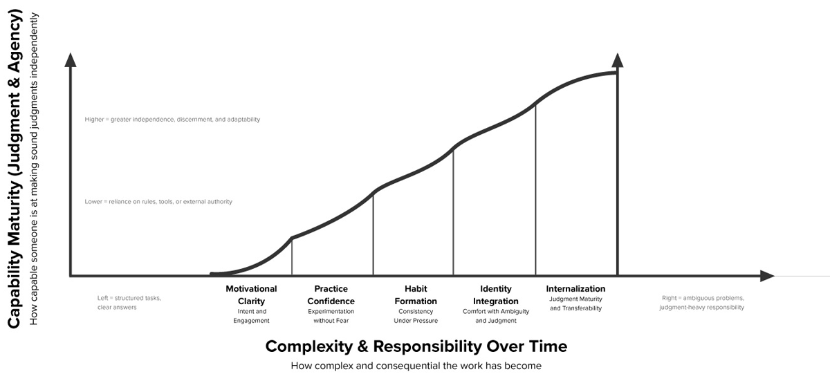 The Personal Capability Arc diagnoses whether individuals have the judgment and agency required to operate effectively as work becomes more complex and consequential. It focuses on how capability matures over time—not on skills, performance, or training completion.